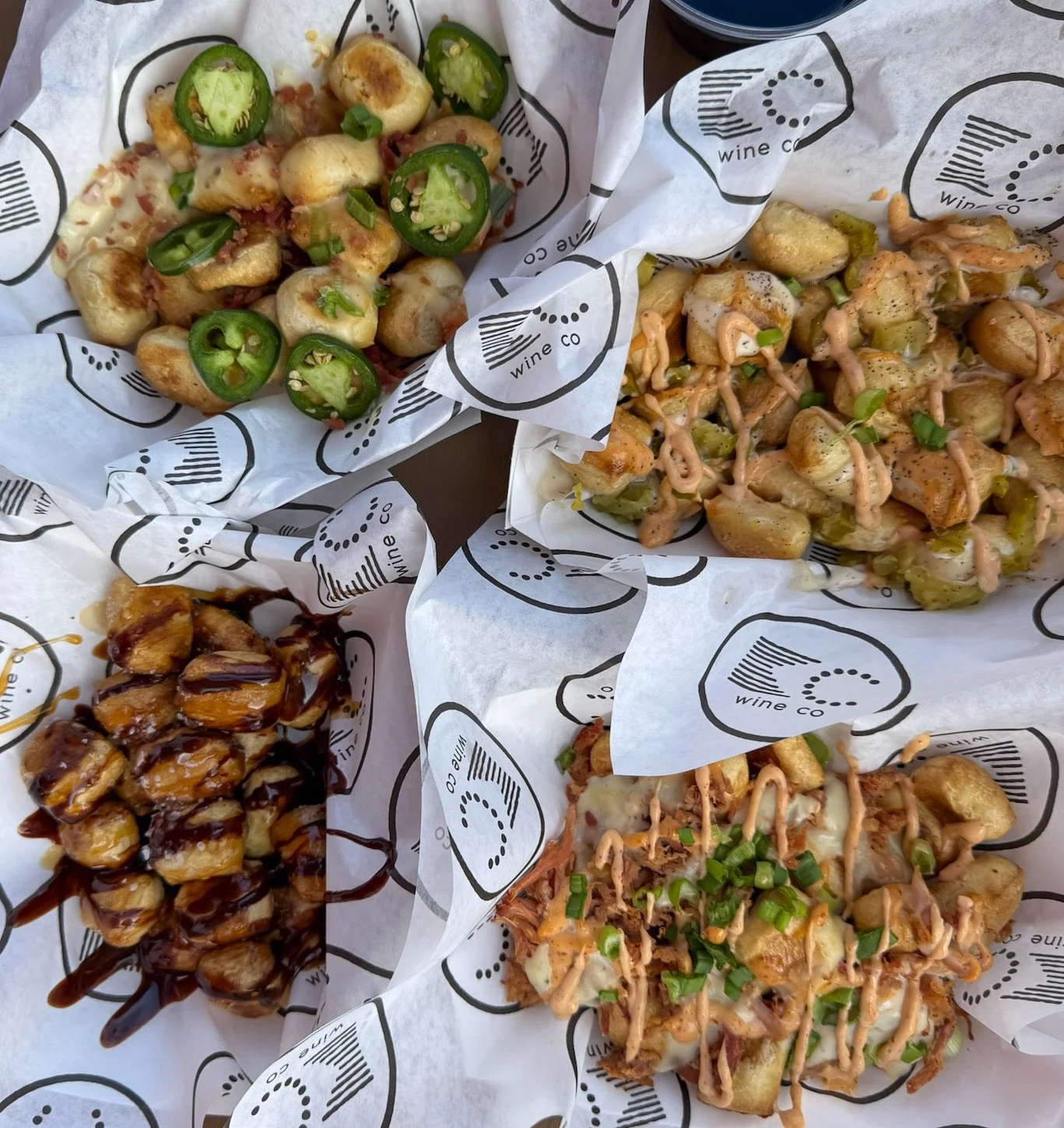Warm beer cheese, bacon, chives, and optional jalapeños piled high on pretzel nuggets. It’s cheesy, smoky, and just spicy enough to keep things interesting.